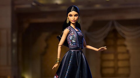നേവി ബ്ലൂ കളറിലുള്ള ട്രഡീഷണല് ലെഹങ്കയാണ് ബാര്ബിയുടെ വേഷം. താമരയുടെയും മുല്ലപ്പൂവിന്റെയും മോട്ടിഫുകളും ലെഹങ്കയില് നല്കിയിട്ടുണ്ട്. വസ്ത്രത്തിന് ചേരുന്ന കമ്മലുകളും വളകളും ബാര്ബിയുടെ ഭംഗി കൂട്ടുന്നു.