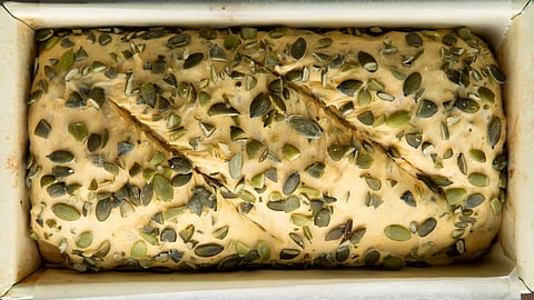 വീണ്ടും പൊങ്ങി വരുന്നതിനായി 60 മിനിറ്റ് മൂടി വയ്ക്കുക. 60 മിനിറ്റ് കഴിയുമ്പോൾ അത് ഇരട്ടിയായി പൊങ്ങി വരുന്നതു കാണാം. ഇനി ഇവയുടെ മുകൾ ഭാഗത്ത് ബട്ടർ പുരട്ടി മൃദുവാക്കുക. ശേഷം ഡ്രൈ റോസ്റ്റ് ചെയ്ത മത്തൻ കുരു വിതറി മുൻപേ പ്രീ ഹീറ്റ് ചെയ്തു വച്ചിരിക്കുന്ന ഓവനിൽ വച്ച് 180°C / 356°F ഹീറ്റിൽ 15-17 മിനിറ്റു വരെ ബേക്കു ചെയ്ത് എടുക്കുക. മൃദുലവും മനോഹരവുമായ, പ്രഭാത ഭക്ഷണമായോ ഉച്ച ഭക്ഷണമായോ നാലുമണിക്ക് കാപ്പിയായിട്ടോ ഒക്കെ കഴിക്കാൻ പാകത്തിനുള്ള പംപ്കിൻ ബ്രഡ് ലോഫ് തയാറായിക്കഴിഞ്ഞു.