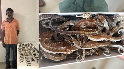 പാലക്കാട് ബസ് സ്റ്റാന്ഡ് പരിസരത്ത് നിന്നും പിടികൂടിയ ഇയാളുടെ കൈയിൽ കടൽ കുതിരകളെ ഉണക്കി ബോക്സിലാക്കിയ നിലയിലായിരുന്നു പിടികൂടുന്നത്. ബോക്സിൽ ഏകദേശം 96 കടൽക്കുതിരകൾ ഉണ്ടായിരുന്നതായും വന്യജീവി സംരക്ഷണം നിയമ പ്രകാരം ഇയാൾക്കെതിരെ കേസെടുത്തതായും വനം വകുപ്പ് അറിയിച്ചു.