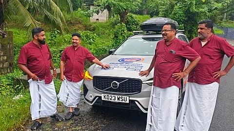 ചിത്രം :ഇംഗ്ലണ്ടിൽ നിന്ന് വോൾവോ കാറിൽ കോതമംഗലത്തെത്തിയ ബിജു പി മാണി, റെജി ജോസഫ്,ഷോയ് ചെറിയാൻ, സാബു ചാക്കോ എന്നിവർ