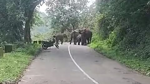 ഇന്ന് രാവിലെയാണ് സംഭവം. കെഎസ്ഇബി ജീവനക്കാരായ രതീഷ് കുന്നത്ത് പ്രസാദ്, മറ്റൊരു ബൈക്കിൽ സഞ്ചരിച്ച ശിവദാസ്, വിനീഷ് എന്നിവരാണ് അത്ഭുതകരമായി രക്ഷപ്പെട്ടത്. കഴിഞ്ഞ ദിവസങ്ങളിലായി ചുരം പാതയിലെ കാട്ടനക്കൂട്ടം സ്ഥിരമായി ഇറങ്ങുന്നത് പതിവായിട്ടുണ്ടെന്ന് നാട്ടുകാർ പറയുന്നു. രണ്ടു കുട്ടികൾ ഉൾപ്പെടെ അഞ്ച് ആനകളാണ് ഉള്ളത്.