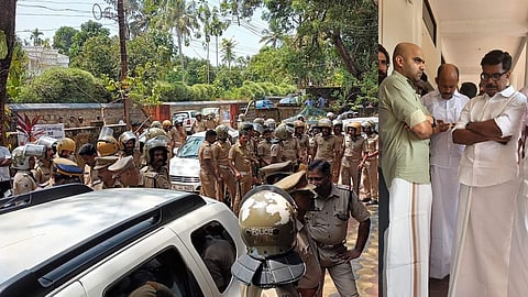 ജാമ്യം കിട്ടി കോടതിക്ക് പുറത്ത് മാധ്യമങ്ങളോട് സംസാരിച്ച് മടങ്ങിയ മാത്യു കുഴൽനാടനെയും മുഹമ്മദ് ഷിയാസിനെയും വീണ്ടും അറസ്റ്റ് ചെയ്യാൻ പൊലീസ് നീക്കം നടന്നു. അഭിഭാഷകർ ഇരുവരെയും ഉന്തി തള്ളി കോടതിക്കുള്ളിൽ കയറ്റി. കോടതി പരിസരം പൊലീസ് വലയത്തിലാണ് .