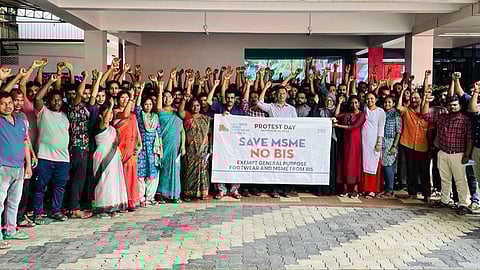കോഴിക്കോട്: ചെറുകിട, ഇടത്തരം പാദരക്ഷാ നിർമാണ സംരംഭങ്ങളുടേയും അനുബന്ധ വ്യവസായ യൂനികളുടേയും ഭാവി അനിശ്ചിതത്വത്തിലാക്കുന്ന തരത്തിൽ ബിഐഎസ് ഗുണമേന്മാ മാനദണ്ഡം നിർബന്ധമാക്കുന്ന കേന്ദ്ര സർക്കാർ നീക്കത്തിനെതിരെ രാജ്യവ്യാപകമായി ഫൂട്ട് വെയർ വ്യവസായികളും സംരംഭകരും പ്രതിഷേധ ദിനം ആചരിച്ചു. ഇതിൻ്റെ ഭാഗമായി ഓള് ഇന്ത്യ എംഎസ്എംഇ ഫൂട്ട് വെയര് കൗണ്സിലിന്റെ നേതൃത്വത്തിൽ കോഴിക്കോട് മോഡേൺ ഇന്ഡസ്ട്രിയല് എസ്റ്റേറ്റില് പ്രതിഷേധ ദിനാചരണത്തിന്റെ സംസ്ഥാന തല ഉദ്ഘാടനം നടന്നു. കേരത്തിലെ വിവിധ ഭാഗങ്ങളിൽ നന്ന് 400ലധികം സ്ഥാപനങ്ങൾ പ്രതിഷേധത്തിൽ പങ്കെടുത്തു.