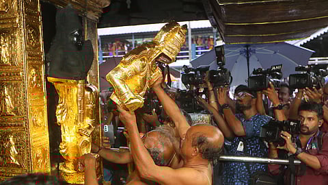 ശബരിമല ശ്രീകോവിലിനു മുന്നിലെ ദ്വാരപാലക ശിൽപ്പങ്ങളിൽ സ്വർണപ്പാളി പുനസ്ഥാപിക്കുന്നു.