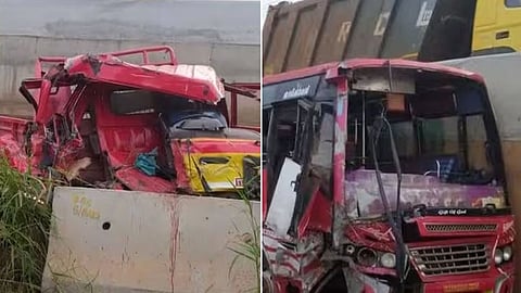 കോഴഇക്കോട് ഭാഗത്തു നിന്നും തൃശൂരിലേക്ക് പോകുന്ന സ്വകാര്യ ബസും ടിപ്പർ ലോറിയുമാണ് കൂട്ടിയിടിച്ചത്. ടിപ്പർ ലോറി പൂർണമായും തകർന്ന നിലയിലാണ്. പൊലീസും നാട്ടുകാരും ചേർന്നായിരുന്നു രക്ഷാപ്രവർത്തനത്തിന് നേതൃത്വം നൽകിയകത്. പരുക്കേറ്റവരെയല്ലാം ആസുപത്രിയിൽ പ്രവേശിപ്പിച്ചു. ആർക്കും ഗുരുതരമായി പരുക്കുകളേറ്റിട്ടില്ലെന്നാണ് വിവരം.