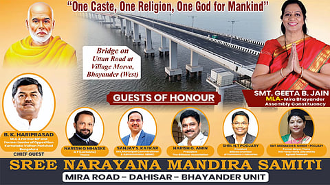 മുംബൈ: ഭായിന്ദർ വെസ്റ്റിലെ മോർവേ വില്ലേജിലെ പാലത്തിനു ശ്രീനാരായണ ഗുരുവിന്റെ പേര് നൽകാൻ മീരാഭായിന്ദർ നഗര സഭ തീരുമാനിച്ചു. നാമകരണ ചടങ്ങ് ഗാന്ധി ജയന്തി ദിനത്തിൽ നടക്കും. വൈകീട്ട് 4.30 നു നടക്കുന്ന ചടങ്ങിൽ ഗീതാഭരത് ജയിൻ എംഎൽഎ നാമകരണ ചടങ്ങു നിർവഹിക്കും. കർണാടക വിധാൻ പരിഷത് മുൻ അംഗവും പ്രതിപക്ഷ നേതാവുമായിരുന്ന ബി.കെ. ഹരിപ്രസാദ് മുഖ്യാതിഥിയായിരിക്കും. പാർലമെന്റ് അംഗം നരേഷ് ജി. മസ്കെ , മുനിസിപ്പൽ കമ്മീഷണർ സഞ്ജയ് എസ്, കാട്കർ ഐഎഎസ്, ബില്ലവർ അസോസിയേഷൻ പ്രസിഡന്റ് ഹരീഷ് സി. അമിൻ, എൻ. ടി. പൂജാരി, താനേ മുൻ മേയർ മീനാക്ഷി ആർ. ഷിൻഡെ, ശ്രീനാരായണ മന്ദിരസമിതി ഭാരവാഹികളായ എം. ഐ. ദാമോദരൻ, എൻ. മോഹൻദാസ്, ഒ. കെ. പ്രസാദ്, എന്നിവർ വിശിഷ്ടാതിഥികളായിരിക്കും.