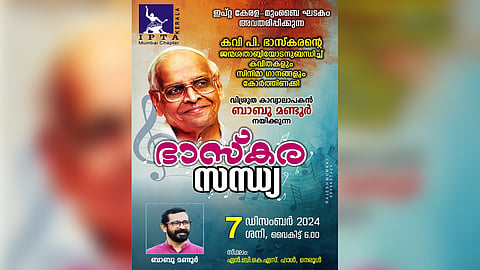 പുലർകാലത്തും പത്തുവെളുപ്പിലും പൗർണമിയിലും പാടിത്തീരാത്തൊരു സാംസ്കാരിക വിശേഷമായ പി. ഭാസ്കരന്റെ കവിതകളും സിനിമാ ഗാനങ്ങളും കോർത്തിണക്കിക്കൊണ്ട് , അദ്ദേഹത്തിന്റെ പ്രധാന രചനകളുടെ സൗന്ദര്യവും പ്രസക്തിയും അടയാളപ്പെടുത്തുന്ന ഭാസ്കരസന്ധ്യ സംഘടിപ്പിക്കുന്നത് ഇപ്റ്റ കേരളയുടെ മുംബൈ ഘടകമാണ്.