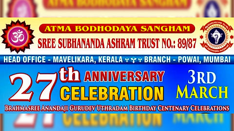 മുംബൈ: ആത്മബോധോദയ സംഘം മാവേലിക്കര ചെറുകോൽ ശ്രീ ശുഭാനന്ദാശ്രമത്തിന്റെ മുംബൈ പവായ് ശാഖയുടെ 27 മത് വാർഷികവും, ബ്രഹ്മശ്രീ ആനന്ദജി ഗുരു ദേവതിരുവടികളുടെ ഉത്രാടം ജന്മനക്ഷത്ര ശതാബ്ദി സർവ്വ ജ്ഞാനോത്സവും ഭക്തി നിർഭരമായ ചടങ്ങുകളോടെ മാർച്ച് 3 ഞായറാഴ്ച നടക്കും.