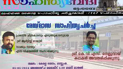 മുംബൈ: മേയ് മാസത്തെ സാഹിത്യ ചർച്ചയിൽ കവിയും കഥാകൃത്തുമായ കെ.വി.എസ് നെല്ലുവായ് രണ്ട് കഥകൾ അവതരിപ്പിക്കും. ചിത്രകാരൻ, എഴുത്തുകാരൻ എന്നീ നിലകളിൽ പ്രശസ്തനായ ഗായത്രിയും സാഹിത്യ വേദിയിൽ പങ്കെടുക്കും. ഞായറാഴ്ച വൈകിട്ട് 4.30ന് മാട്ടുംഗ കേരള ഭവനത്തിലാണ് സാഹിത്യചർച്ച. ചിത്രകാരൻ ഗായത്രി വാക്കും വരയും എന്ന വിഷയത്തിൽ പ്രഭാഷണം നടത്തും.