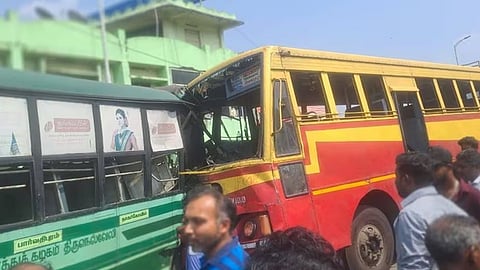 നാഗർ കോലിൽ നിന്നും തിരുവനന്തഭാഗത്തേക്ക് വരുകയായിരുന്ന കെഎസ്ആർടിസി ബസും കളിയിക്കാവിളയിൽ നിന്നും കന്യാകുമാരിയിലേക്ക് പോവുകയായിരുന്ന തമിഴ്നാട് ട്രാൻപോർട്ടും കൂട്ടിയിടിച്ചാണ് അപകടം. കെഎസ്ആർടിസി ബസ് മുന്നിലുള്ള ടോറസ് ലോറിയെ മറികടക്കാൻ ശ്രമിച്ചപ്പോൾ മറുഭാഗത്തുനിന്ന് വരുകയായിരുന്ന തമിഴ്നാട് ബസുമായി കൂട്ടിയിടിക്കുകയായിരുന്നു.