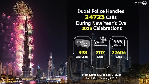 ദുബായ്: 2024 ഡിസംബർ 31ന് ഉച്ച മുതൽ 2025 ജനുവരി 1ന് ഉച്ച വരെ, പുതു വത്സരാഘോഷത്തോടനുബന്ധിച്ച് എമർജൻസി, നോൺ എമർജൻസി ലൈനുകൾ വഴി 24,723 കോളുകൾ ലഭിച്ചതായി ദുബായ് പൊലീസ് അറിയിച്ചു.
