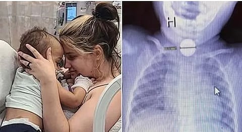കൈ എന്ന കുഞ്ഞ് അമ്മ മഡലൈൻ ഡണിന്റെ കരങ്ങളിൽ(ഇടത്) കുഞ്ഞിന്റെ എക്സ്റേയിൽതെളിഞ്ഞു കാണുന്ന ബട്ടൺ ബാറ്ററി(വലത്)