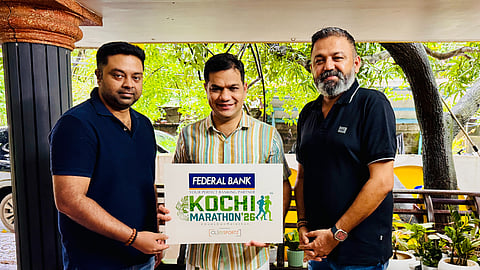 ഫെഡറൽ ബാങ്ക് കൊച്ചി മാരത്തൺ 2026 രജിസ്ട്രേഷൻ ഹൈബി ഈഡൻ എംപി ഉദ്ഘാടനം ചെയ്യുന്നു. ക്ലിയോസ്പോർട്സ് ഡയറക്റ്റർ ശബരി നായർ, വൈസ് പ്രസിഡന്റ്, മാർക്കറ്റിങ്, നിധുൻ സദാനന്ദൻ എന്നിവർ സമീപം.