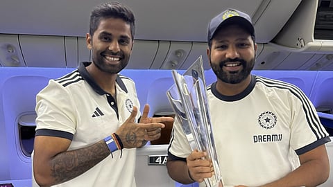 വിമാനത്തിനുള്ളിൽ ട്രോഫിയുമായി നിൽക്കുന്ന ചിത്രം ഇന്ത്യൻ ക്യാപ്റ്റൻ രോഹിത് ശർമ ഇൻസ്റ്റഗ്രാമിൽ പോസ്റ്റ് ചെയ്തിരുന്നു. താരങ്ങളെ കൂടാതെ അവരുടെ കുടുംബാംഗങ്ങളും സപ്പോർട്ട് സ്റ്റാഫും ബിസിസിഐ അധികൃതരും മാധ്യമ പ്രവർത്തകരുമെല്ലാം ഇതേ വിമാനത്തിലുണ്ട്.