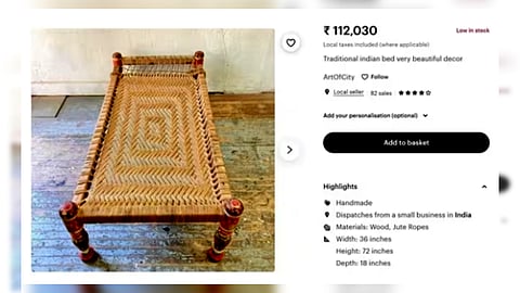എന്താണന്നല്ലേ.. സംഭവം ഒരു ചാർപ്പായയാണ്, എന്നുവച്ചാൽ കയറ്റുകട്ടിൽ. വിലയാണെങ്കിൽ ഒരു ലക്ഷവും. ഞെട്ടണ്ട... സംഭവം ഉള്ളതു തന്നെ. ഇന്ത്യന് വീടുകളിൽ വ്യാപകമായി ഉപയോഗിച്ചു വരുന്ന ഈ ഉത്പന്നമാണ് അമെരിക്കന് ഇ-കൊമെഴ്സ് കമ്പനിയായ എറ്റ്സിയുടെ (Etsy) ഷോപ്പിങ് പോർട്ടലിൽ 1,12,168 രൂപയ്ക്ക് ലിസ്റ്റ് ചെയ്തിരിക്കുന്നത്.