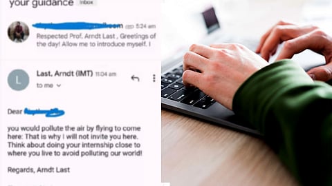 എന്നാൽ സ്ക്രീൻഷോട്ടിലെ പ്രൊഫസറുടെ അസാധാരണമായ മറുപടിയാണ് സാമൂഹിക മാധ്യമ ഉപയോക്താക്കളുടെ ശ്രദ്ധ പിടിച്ചുപറ്റിയത്. നിങ്ങളുടെ മാർഗനിർദേശത്തിന് കീഴിൽ ഇന്റേൺഷിപ്പ് തേടുന്നു' എന്ന തലക്കെട്ടിലുള്ള ഇമെയിലിന് മറുപടിയായി, ഇങ്ങോട്ടേക്കു പറന്നു വരുന്നതിലൂടെ നിങ്ങൾ ഞങ്ങളുടെ അന്തരീക്ഷം മലിനമാക്കും. അതു കൊണ്ട് ഞാൻ നിങ്ങളെ ഇങ്ങോട്ട് ക്ഷണിക്കില്ല. ഞങ്ങളുടെ ലോകത്തെ മലിനമാക്കാതിരിക്കാനായി നിങ്ങൾ ജീവിക്കുന്നതിനു അടുത്തായി എവിടെയെങ്കിലും ഇന്റേൺഷിപ്പ് ചെയ്യുന്നതിനെക്കുറിച്ച് ചിന്തിക്കുക. എന്നായിരുന്നു പ്രൊഫസർ കുറിച്ചത്.