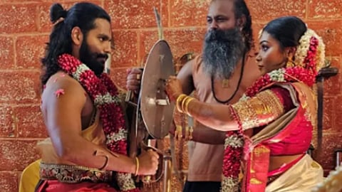 നേമം അഗസ്ത്യം കളരിയിലാണ് ഇന്നലെ ഉച്ചയ്ക്ക് വേറിട്ട ശൈലിയിൽ വിവാഹം നടന്നത്. ഇതേ കളരിയില് പഠിച്ച ഇരുവരും അവിടെത്തന്നെ പരിശീലകരുമായിരുന്നു.